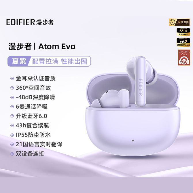 漫步者/EDIFIER 真无线深度降噪蓝牙耳机 入耳式HiFi音质耳麦 同声传译长续航手机耳塞AtomEvo 双复合强磁动圈HiFi音质,空间音效,混合深度降噪,6麦通话降噪,蓝牙6.0,长效续航,游戏低延迟,多EQ音效,IP55防尘防水,APP多语种翻译 兑换价格 12800 里程 会员卡别 终身白金卡 白金卡 金卡 银卡 普通卡 儿童卡 服务 由 智科精品 发货并提供售后 颜色: 黑色 象牙白色 紫罗兰色 购买数量: 件 库存件 配送地址: 立即购买 加入购物车 成功添加到购物车 关闭 购物车共有 种商品 总金额为: 组合销售 产品介绍 产品规格 售后服务 产品咨询 发现好货 漫步者(EDIFIER) H230P入耳式重低音手机耳机/线控可通话运动耳塞 低失真 强劲低频 2700 里程 飞利浦/Philips 蓝牙耳机 TAT1199-米白色 真无线半入耳式运动跑步迷你音乐降噪游戏低延迟长续航通用华为苹果 3500 里程 飞利浦(PHILIPS) TAT2708 开放式真无线不入耳挂耳式耳机健身运动跑步 5500 里程 联想/Lenovo EA420 耳夹式 无线运动蓝牙耳机 2600 里程 纽曼 MX660线控通话耳机手机入耳式通用耳塞苹果安卓通用 1300 里程