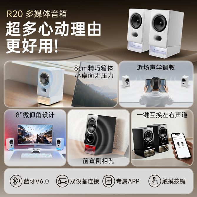 漫步者/EDIFIER 桌面2.0电脑蓝牙音响 幻彩氛围灯效无线USB音箱R20白 电视电脑音箱 小巧箱体,声场精准,高清拾音,曙光灯效,USB一线通即插即用,蓝牙6.0,双设备连接,app操控,智能耳麦接口。 兑换价格 8500 里程 会员卡别 终身白金卡 白金卡 金卡 银卡 普通卡 儿童卡 服务 由 智科精品 发货并提供售后 颜色: 白色 购买数量: 件 库存件 配送地址: 立即购买 加入购物车 成功添加到购物车 关闭 购物车共有 种商品 总金额为: 组合销售 产品介绍 产品规格 售后服务 产品咨询 发现好货 漫步者(EDIFIER) R12U台式电脑音响低音炮手机迷你笔记本小音箱USB 台式/笔记本音响 支持USB 时尚外观设计 4000 里程 漫步者(EDIFIER) R10U台式/笔记本电脑USB小音箱 迷你音响 多媒体桌面数码低音炮 3500 里程 漫步者(EDIFIER) R101V多媒体有源音箱2.1声道电脑音响 桌面重低音炮 6500 里程 纽曼(Newmine)N63收音机半导体唱戏机评书戏曲插卡音箱音响 2200 里程 小米 小爱同学音箱Play基础款 AIoT语音控制 蓝牙Mesh网关 音乐小说智能音箱智能音响 4800 里程