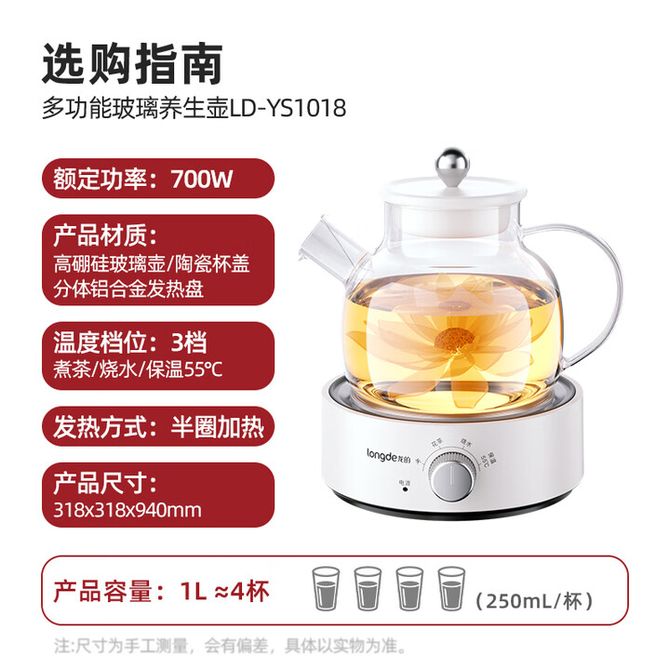龙的/Longde 3档旋钮操作多功能玻璃养生壶迷你1L小功率宿舍煮茶养生烧水壶 LD-YS1018 1000毫升大容量 旋钮操控 高硼硅玻璃分体 3档旋钮操作 兑换价格 5100 里程 会员卡别 终身白金卡 白金卡 金卡 银卡 普通卡 儿童卡 服务 由 弘济家电 发货并提供售后 颜色: 其他 购买数量: 件 库存件 配送地址: 立即购买 加入购物车 成功添加到购物车 关闭 购物车共有 种商品 总金额为: