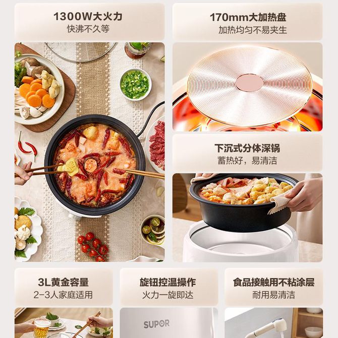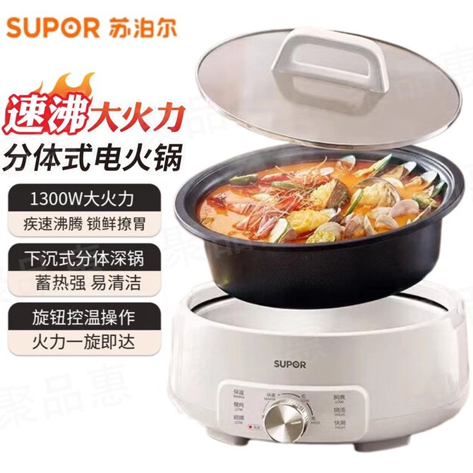 苏泊尔(SUPOR) 电煮锅家用3L大容量分体式1300W大火力多多功能电热锅速热不沾火锅专用锅 1300W大火力快沸不久等 170mm大加热盘加热均匀不易夹生 兑换价格 7800 里程 会员卡别 终身白金卡 白金卡 金卡 银卡 普通卡 儿童卡 服务 由 聚品惠家电生活馆 发货并提供售后 颜色: 其他 购买数量: 件 库存件 配送地址: 立即购买 加入购物车 成功添加到购物车 关闭 购物车共有 种商品 总金额为: