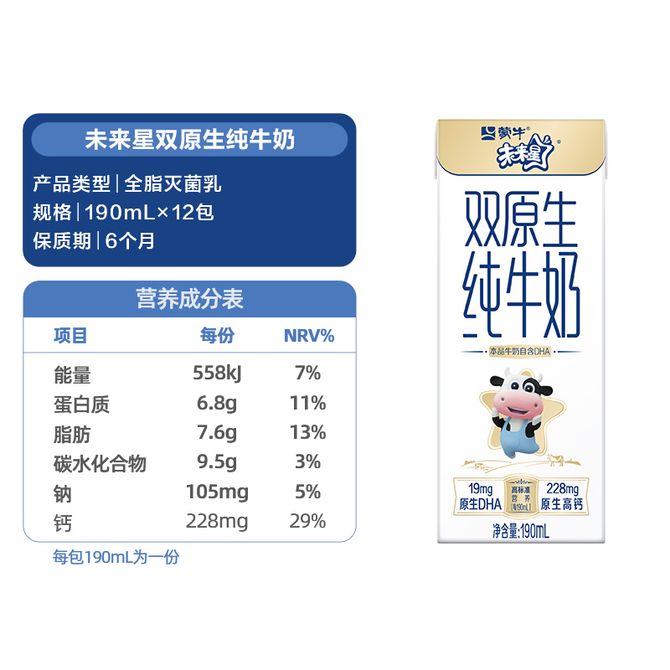 蒙牛 未来星双原生纯牛奶利乐苗条装190ml×12包 两提装 原生牛乳 呵护健康成长 兑换价格 5600 里程 会员卡别 终身白金卡 白金卡 金卡 银卡 普通卡 儿童卡 服务 由 致良优选 发货并提供售后 规格: 组合 购买数量: 件 库存件 配送地址: 立即购买 加入购物车 成功添加到购物车 关闭 购物车共有 种商品 总金额为: 组合销售 产品介绍 产品规格 售后服务 产品咨询 发现好货 蒙牛 特仑苏纯牛奶苗条装250ml×12盒 2900 里程 三元 经典小方白全脂纯牛奶250ml*24盒牛奶 整箱 3400 里程 伊利金典纯牛奶250ml*12盒整箱 2200 里程 伊利 金典纯牛奶整箱 250ml*12盒 3.6g乳蛋白 原生高钙 礼盒装 1800 里程 特仑苏 新日期纯牛奶250ml*12盒 3.6g乳蛋白 礼盒装 京东/顺丰发货 2400 里程