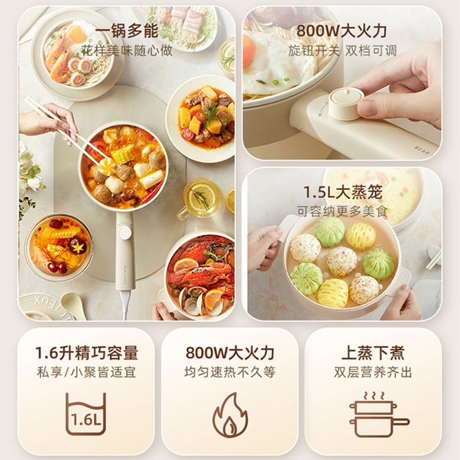 小熊/Bear 电煮锅1.6L小电锅宿舍小锅多功能电热锅电蒸锅学生宿舍泡面小火锅 一锅多能花样美味随心做 800W大火力旋钮开关双档可调 1.5L大蒸笼可容纳更多美食 兑换价格 4400 里程 会员卡别 终身白金卡 白金卡 金卡 银卡 普通卡 儿童卡 服务 由 聚品惠家电生活馆 发货并提供售后 颜色: 其他 购买数量: 件 库存件 配送地址: 立即购买 加入购物车 成功添加到购物车 关闭 购物车共有 种商品 总金额为: