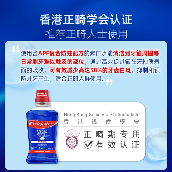 高露洁/Colgate 正畸专研漱口水500ml 矫正牙齿专用含氟清新口气去口臭深层清洁 抑制早期蛀斑 防蛀健齿 兑换价格 4400 里程 会员卡别 终身白金卡 白金卡 金卡 银卡 普通卡 儿童卡 服务 由 锦宁商贸 发货并提供售后 化妆品容量: 500g/ml 购买数量: 件 库存件 配送地址: 立即购买 加入购物车 成功添加到购物车 关闭 购物车共有 种商品 总金额为: 组合销售 产品介绍 产品规格 售后服务 产品咨询 发现好货 舒客 沁爽清新漱口水(茶爽新)500mL*2大瓶 去口臭温和不辣口无醇涑口液口味含氟 1600 里程 高露洁(Colgate)漱口水250ml*2瓶元气薄荷味 1700 里程 高露洁(Colgate)贝齿鲜果薄荷漱口水500ml×3(新老包装随机发货) 3400 里程 舒客 专效抑菌漱口水500ML*2 清新口气 高效杀菌(不同包装随机) 1400 里程 高露洁/Colgate 漱口水 温和0酒精 500ml单瓶装 茉莉绿茶味 新旧包装随机发 1300 里程