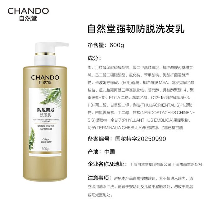 自然堂/Chando 防脱固发洗发乳600ml 控油蓬松洗发露清爽油头洗发不油腻洗发水