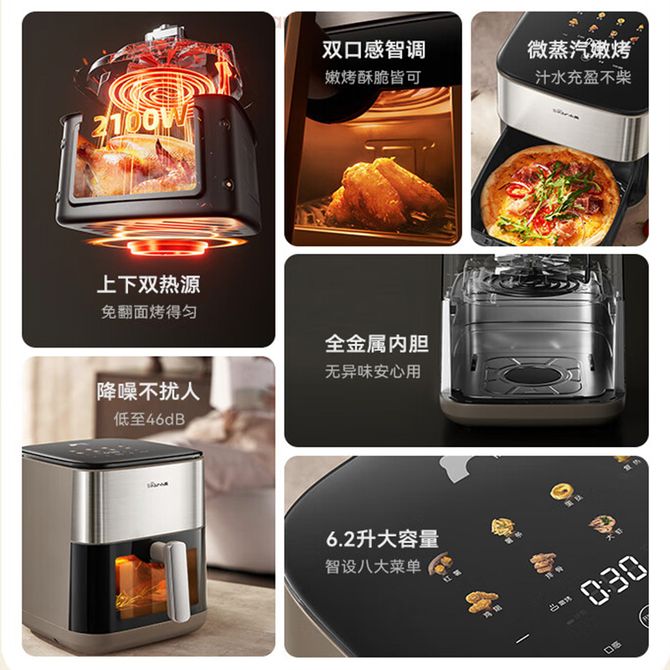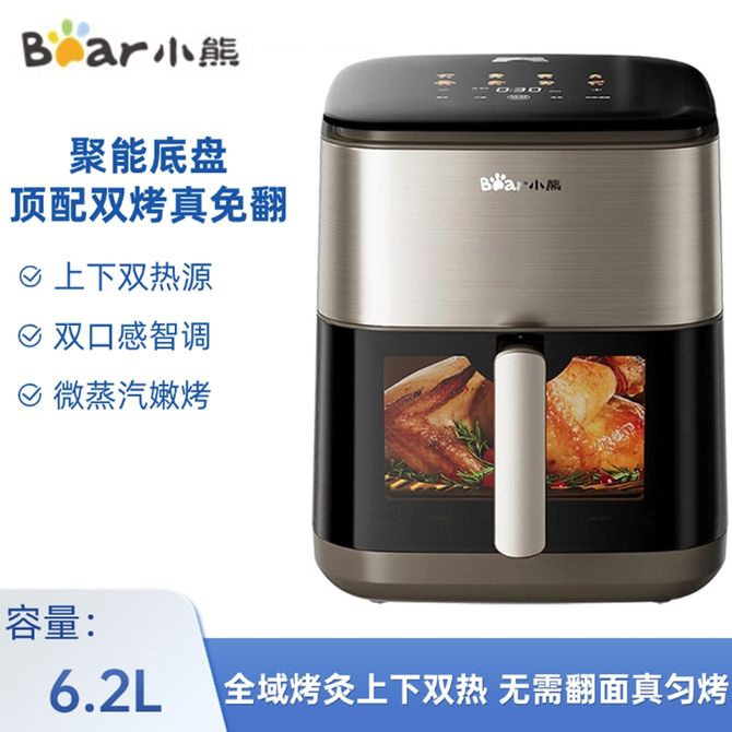小熊/Bear 空气炸锅家用双热源金属内腔可视烤箱双加热多功能 全金属内胆无异味安心用 6.2升大容量智设八大菜单 兑换价格 15200 里程 会员卡别 终身白金卡 白金卡 金卡 银卡 普通卡 儿童卡 服务 由 聚品惠家电生活馆 发货并提供售后 颜色: 其他 购买数量: 件 库存件 配送地址: 立即购买 加入购物车 成功添加到购物车 关闭 购物车共有 种商品 总金额为: 组合销售 产品介绍 产品规格 售后服务 产品咨询 发现好货 苏泊尔(SUPOR)空气炸锅 家用多功能4.2L大容量 烤箱薯条机 无油烟电炸锅 大功率 无油低脂煎炸锅KJ42D811 6500 里程 苏泊尔(SUPOR)空气炸锅家用3L大容量电炸锅 蒸汽嫩炸多功能无油烟煎炸薯条机烤箱KD30DQ815 21700 里程 美的/Midea 空气炸锅 家用5升可视炸锅金属内腔体微蒸汽多功能智能双旋控温电炸锅 KZE5089 10900 里程 美的/Midea 空气炸锅 可视 不用翻面 金属内腔 蒸汽嫩炸 三档烘烤风力 5L KZC5089 10700 里程 小熊/Bear 空气炸锅 4D漩烤不用翻面 全自动 5L实用大容量 可视 蒸汽嫩炸 控油脱脂 炸烤箱一体机 9100 里程