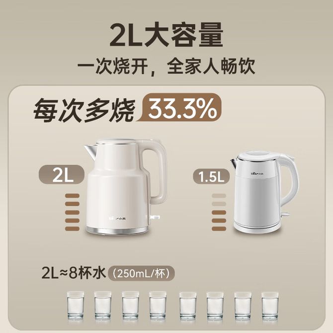 小熊/Bear 电热水壶 烧水壶 家用 2L大容量316L不锈钢 智能双层防烫极速烧水 ZDH-F20M5 2L大容量;2100W大功率;两段式阻尼开盖; 兑换价格 6100 里程 会员卡别 终身白金卡 白金卡 金卡 银卡 普通卡 儿童卡 服务 由 小枫叶专营店 发货并提供售后 颜色: 白色 购买数量: 件 库存件 配送地址: 立即购买 加入购物车 成功添加到购物车 关闭 购物车共有 种商品 总金额为: 组合销售 产品介绍 产品规格 售后服务 产品咨询 发现好货 苏泊尔(SUPOR)电水壶 1.7L 不锈钢/YL SW-17S13A 5700 里程 美菱/MELNG 电水壶304不锈钢烧水壶家用1.7L大容量米白色 MH-K79A 3000 里程 美的/Midea 电热水壶家用大容量烧水壶热水壶双层防烫电水壶304不锈钢内胆自动断电分离式拔盖 MK-SH15X1-102 3000 里程 小熊/Bear 电水壶家用烧水壶 不锈钢自动断电恒温热水壶保温一体电热水壶1.5L容量 3000 里程 志高/Chigo 电水壶烧水壶1.8L大容量电热水壶双层防烫自动断电家用烧水开水壶不锈钢 电水壶 DC-A18F 1900 里程