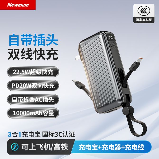纽曼(Newmine) 10000mAh带插头充电宝自带线三合一超薄小巧便携快充移动电源 曜石黑 3C认证 可上飞机 机身有3C标识 兑换价格 6500 里程 会员卡别 终身白金卡 白金卡 金卡 银卡 普通卡 儿童卡 服务 由 贝洛美智能科技精品馆 发货并提供售后 电池容量: 8001mAh-10000mAh 颜色: 黑色 购买数量: 件 库存件 配送地址: 立即购买 加入购物车 成功添加到购物车 关闭 购物车共有 种商品 总金额为: 组合销售 产品介绍 产品规格 售后服务 产品咨询 发现好货 ZNNCO 充电宝20000毫安时超薄小巧迷你自带线大容量快充移动电源便携苹果华为小米2万mAh手机 4200 里程 睿量/Remax 磁吸无线充电宝 Magsafe快充 5000mAh超薄小巧便携移动电源 手机背夹迷你移动电源 适用于苹果华为小米手机 RPP-107 4600 里程 雷摄 T68S【3C认证可上飞机】充电宝10000毫安 移动电源 22.5W快充丨1万毫安丨多口输出 1700 里程 纽曼(Newmine) 自带四线充电宝 3C认证 LED智能数显10000毫安移动电源 AL03 经典黑 3000 里程 雷摄 【3C认证】LS-YDZJ01 10000毫安 四线多功能移动电源 黑色 2000 里程