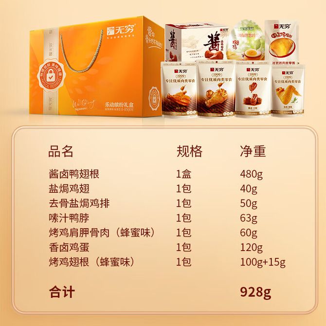 无穷 肉类零食礼盒 休闲零食卤货组合 年货零食过年送礼 乐动缤纷礼盒928g 无穷 乐动缤纷礼盒928g(含7款零食) 兑换价格 8700 里程 会员卡别 终身白金卡 白金卡 金卡 银卡 普通卡 儿童卡 商品已下架 1. 请联系卖家咨询 2. 逛逛优米酷食品专营店选择其他商品 组合销售 产品介绍 产品规格 售后服务 产品咨询 发现好货 蒙都 风干牛肉干 500g (原味/五香/孜然/香辣)下单备注口味 新老包装随机 7000 里程 蒙都 酱牛肉200g*2袋 卤牛肉 熟食 内蒙古特产 五香真空包装熟牛肉 4100 里程 百草味 白芝麻猪肉脯100g 休闲零食肉干肉脯 1100 里程 百草味 原切牛肉片50g*1袋 牛肉干休闲零食 特产小吃肉干 1500 里程 三只松鼠(Three Squirrels) 蜀香牛肉麻辣味肉脯即食卤味牛肉 100gx2袋 1300 里程