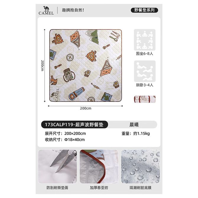 骆驼/Camel 户外野餐垫防潮垫春游草地野炊露营地垫户外垫子沙滩垫装备用品 173CALP119,晨曦 骆驼/Camel 超声波野餐垫超声波野餐垫 晨曦200*200cm 兑换价格 4400 里程 会员卡别 终身白金卡 白金卡 金卡 银卡 普通卡 儿童卡 服务 由 亿宇安百户外专营店 发货并提供售后 颜色: 其他 购买数量: 件 库存件 配送地址: 立即购买 加入购物车 成功添加到购物车 关闭 购物车共有 种商品 总金额为: