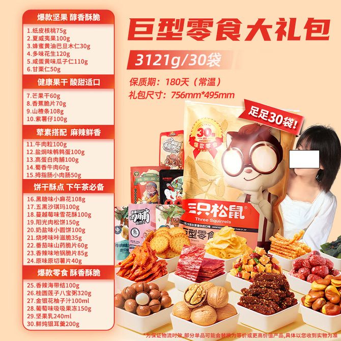 三只松鼠(Three Squirrels) 经典爆款_3121g/30袋】巨型零食大礼包 周一到周五 工作日发货 兑换价格 6000 里程 会员卡别 终身白金卡 白金卡 金卡 银卡 普通卡 儿童卡 服务 由 川林商贸食品店 发货并提供售后 规格: 袋装 购买数量: 件 库存件 配送地址: 立即购买 加入购物车 成功添加到购物车 关闭 购物车共有 种商品 总金额为: