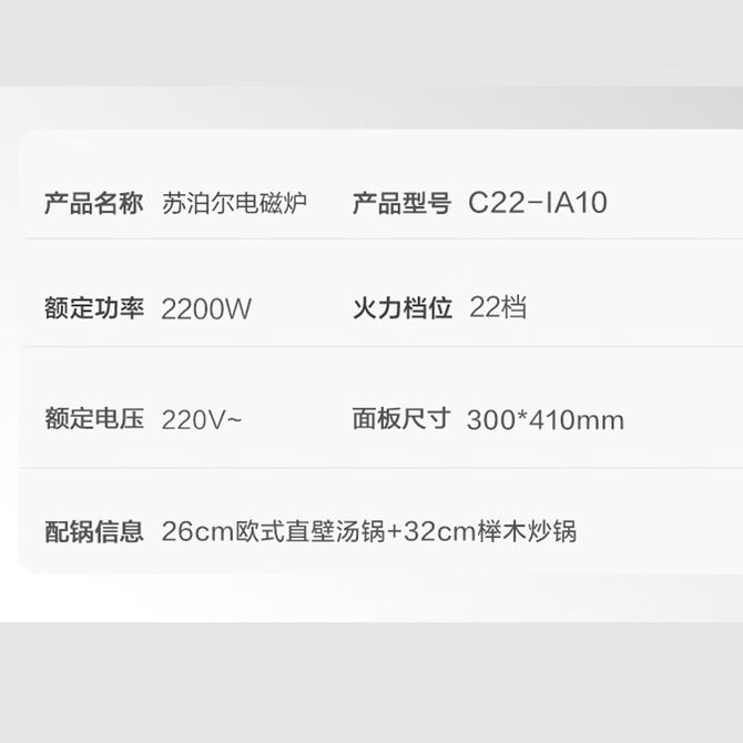 苏泊尔(SUPOR) 电磁灶家用2200W大功率大面板大线圈预约定时 C22-IA10 电磁灶家用2200W大功率大面板大线圈预约定时 C22-IA10 兑换价格 26100 里程 会员卡别 终身白金卡 白金卡 金卡 银卡 普通卡 儿童卡 服务 由 禾木电器馆 发货并提供售后 颜色: 其他 购买数量: 件 库存件 配送地址: 立即购买 加入购物车 成功添加到购物车 关闭 购物车共有 种商品 总金额为: 组合销售 产品介绍 产品规格 售后服务 产品咨询 发现好货 美的/Midea 电磁炉2100W大功率家用触控按键耐用面板八档火力定时功能防水电磁灶火锅炉C21-RT21E01 2100W大功率 6500 里程 美的(Midea) 电磁炉 家用大火力电池炉电磁灶 RT21E0105 7000 里程 美的(Midea)电磁炉商用2200W大功率配锅套装家用电磁灶触控MC-CL22Q1-405J 7800 里程 美的/Midea 电磁炉 家用大功率 4D防水面板 2200W大火力炒菜火锅不粘炒锅一体小型电磁灶 5700 里程 小米 米家电磁炉青春版 2100W大功率 9档变频控温 DCL002CM 9600 里程