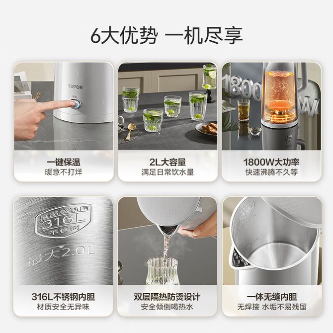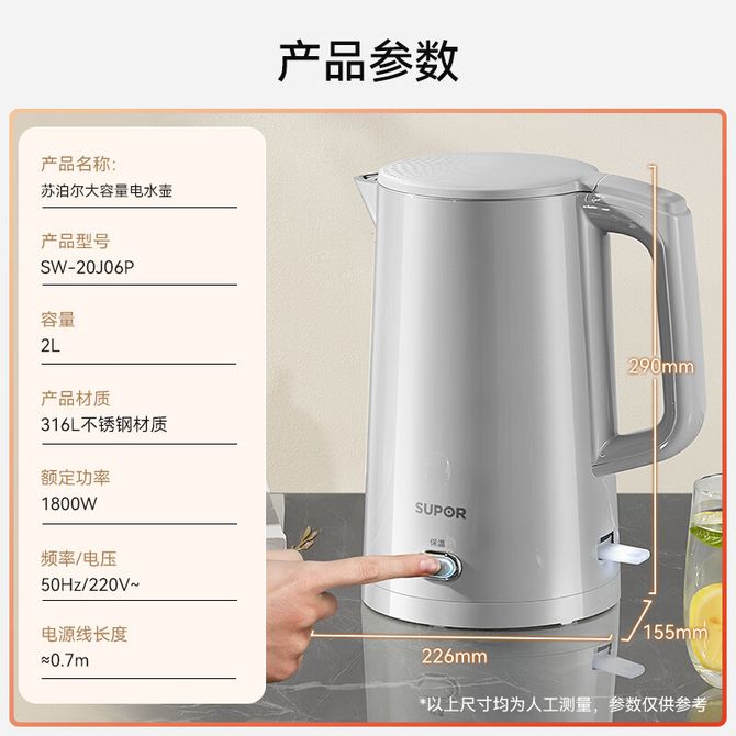 苏泊尔(SUPOR) 电水壶SW-20J06P 烧水壶保温一体 2L大容量家用电热水壶316L不锈钢 恒温水壶 烧水壶保温一体 2L大容量家用电热水壶316L不锈钢 恒温水壶 兑换价格 8400 里程 会员卡别 终身白金卡 白金卡 金卡 银卡 普通卡 儿童卡 服务 由 纳华优选 发货并提供售后 颜色: 灰色 购买数量: 件 库存件 配送地址: 立即购买 加入购物车 成功添加到购物车 关闭 购物车共有 种商品 总金额为: 组合销售 产品介绍 产品规格 售后服务 产品咨询 发现好货 苏泊尔(SUPOR)电水壶 1.7L 不锈钢/YL SW-17S13A 5700 里程 志高/Chigo 电水壶烧水壶1.8L大容量电热水壶双层防烫自动断电家用烧水开水壶不锈钢 电水壶 DC-A18F 1900 里程 美的/Midea 电热水壶家用大容量烧水壶热水壶双层防烫电水壶304不锈钢内胆自动断电分离式拔盖 MK-SH15X1-102 3000 里程 小熊/Bear 电水壶家用烧水壶 不锈钢自动断电恒温热水壶保温一体电热水壶1.5L容量 3500 里程 小熊/Bear 烧水壶电水壶热水壶电热水壶开水壶304不锈钢内胆双层防烫1.5L大容量ZDH-Q15U8 3000 里程
