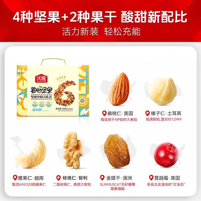 沃隆 750g 每日坚果(活力款) 混合干果仁坚果炒货礼盒 兑换价格 5000 里程 会员卡别 终身白金卡 白金卡 金卡 银卡 普通卡 儿童卡 服务 由 中优盈信品质生活馆 发货并提供售后 规格: 盒装 购买数量: 件 库存件 配送地址: 立即购买 加入购物车 成功添加到购物车 关闭 购物车共有 种商品 总金额为: