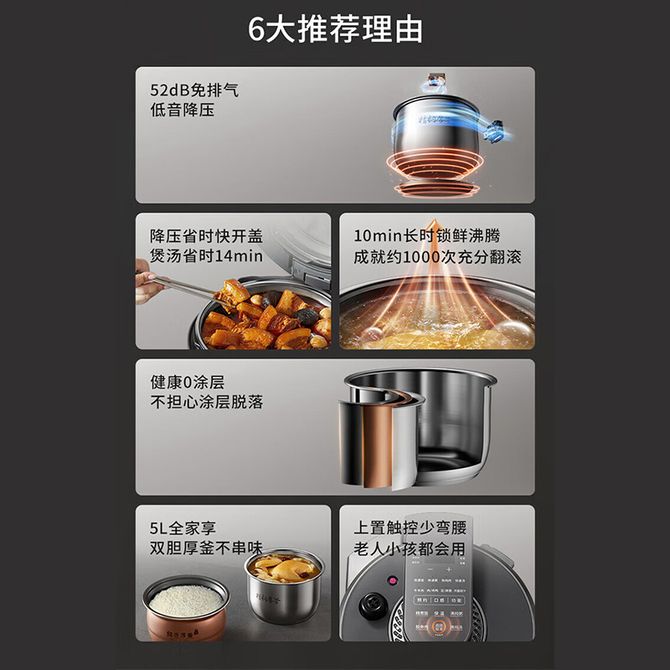 组合销售 产品介绍 产品规格 售后服务 产品咨询 发现好货 苏泊尔(SUPOR)电压力锅 6升大容量 智能触控 球釜双胆 开盖收汁 一键排压 SY-60YC8001Q 高压锅 16900 里程 美的/Midea 电压力锅家用5L大容量多功能高压锅双胆一键收汁智能预约不粘电高压锅电饭锅煮粥煲汤锅 一锅双胆【一键收汁入味】 YL50M1-702 10600 里程 苏泊尔(SUPOR) 5L电压力锅家用电高压锅双胆高压电饭锅煮饭智能预约 SY-50YC8186 11300 里程 美的/Midea 电压力锅 【一锅双胆】5L全自动家用智能预约 上蒸下煮 不粘双胆煲汤炖肉 YL50Q3-451 10900 里程 美的/Midea 电压力锅 高压锅家用电压力煲智能预约电饭煲大容量多功能定时预约电饭煲3-8人单胆旋钮款4L MY-E4809 8700 里程