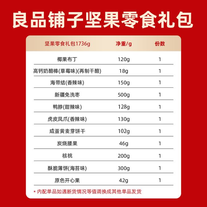良品铺子 11种混合零食坚果组合零食礼包春节走亲戚礼盒礼包338型1736g 含2款坚果1款干果1款炒货+2款肉脯+5款零食;新老包装交替发货 兑换价格 10400 里程 会员卡别 终身白金卡 白金卡 金卡 银卡 普通卡 儿童卡 服务 由 优米酷食品专营店 发货并提供售后 规格: 礼盒 购买数量: 件 库存件 配送地址: 立即购买 加入购物车 成功添加到购物车 关闭 购物车共有 种商品 总金额为: