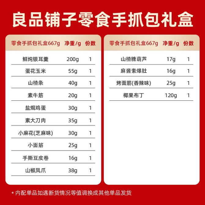 良品铺子 手抓包礼盒108型667g 14款零食大礼包整箱送朋友生日礼物肉干脯辣条卤味解馋小吃年货礼盒 含14款零食;新老包装交替发货 兑换价格 3400 里程 会员卡别 终身白金卡 白金卡 金卡 银卡 普通卡 儿童卡 服务 由 优米酷食品专营店 发货并提供售后 规格: 礼盒 购买数量: 件 库存件 配送地址: 立即购买 加入购物车 成功添加到购物车 关闭 购物车共有 种商品 总金额为: