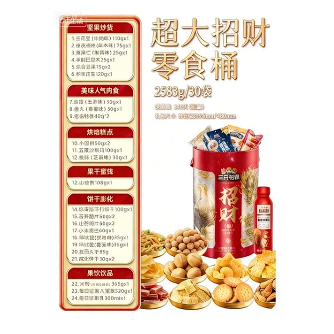 三只松鼠 超大招财零食桶 零食桶30包/2583g 【招财零食桶30包/2583g】坚果果干零食炒货全都有 兑换价格 9600 里程 会员卡别 终身白金卡 白金卡 金卡 银卡 普通卡 儿童卡 服务 由 兴旺食品店 发货并提供售后 规格: 礼盒 购买数量: 件 库存件 配送地址: 立即购买 加入购物车 成功添加到购物车 关闭 购物车共有 种商品 总金额为: 组合销售 产品介绍 产品规格 售后服务 产品咨询 发现好货 西域美农 新疆薄皮核桃500g/袋 新疆特产原味 薄皮核桃 1300 里程 西域美农 烘焙腰果200g 坚果特产 休闲零食 带皮腰果仁 1600 里程 味滋源 紫皮腰果2袋装 每袋100g 1100 里程 沃隆每日坚果(A)175g盒装 1700 里程 百草味 坚果炒货夏威夷果100g*1袋 1100 里程