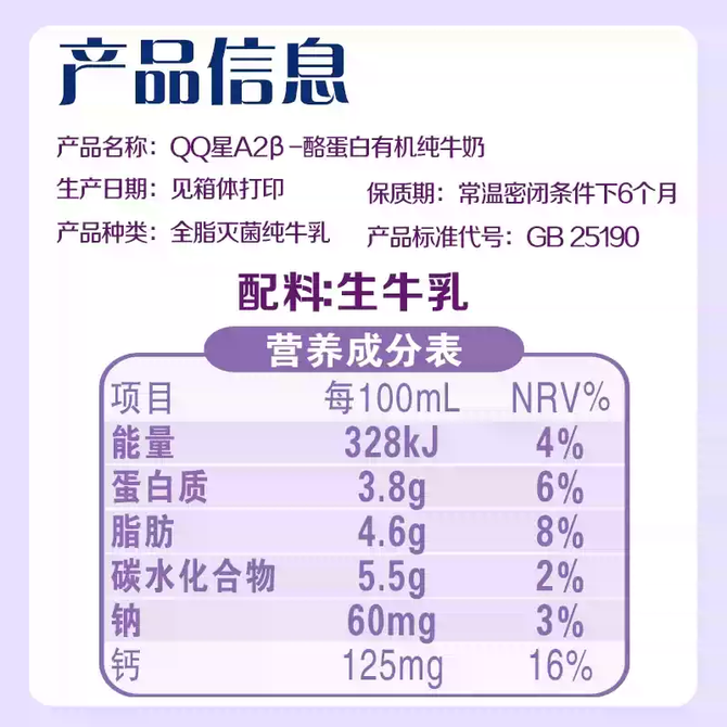 伊利 QQ星 专属儿童营养 A2β-酪蛋白有机纯牛奶 195毫升*10盒 亲和营养好吸收 亲和舒适 宝贝喜欢 兑换价格 3400 里程 会员卡别 终身白金卡 白金卡 金卡 银卡 普通卡 儿童卡 服务 由 全食行 发货并提供售后 规格: 盒装 购买数量: 件 库存件 配送地址: 立即购买 加入购物车 成功添加到购物车 关闭 购物车共有 种商品 总金额为: 组合销售 产品介绍 产品规格 售后服务 产品咨询 发现好货 蒙牛 特仑苏纯牛奶苗条装250ml×12盒 2900 里程 三元 经典小方白全脂纯牛奶250ml*24盒牛奶 整箱 3400 里程 伊利金典纯牛奶250ml*12盒整箱 2200 里程 伊利 金典纯牛奶整箱 250ml*12盒 3.6g乳蛋白 原生高钙 礼盒装 1800 里程 特仑苏 新日期纯牛奶250ml*12盒 3.6g乳蛋白 礼盒装 京东/顺丰发货 2400 里程