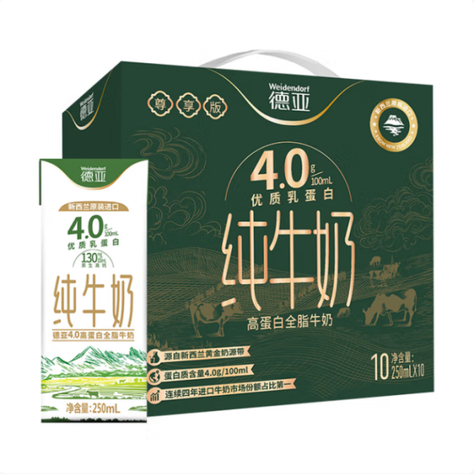 德亚 营养全脂牛奶250ml*10新西兰进口 规格250ml*10盒 ,新旧包装随机发货 兑换价格 2500 里程 会员卡别 终身白金卡 白金卡 金卡 银卡 普通卡 儿童卡 服务 由 一间食品馆 发货并提供售后 规格: 盒装 购买数量: 件 库存件 配送地址: 立即购买 加入购物车 成功添加到购物车 关闭 购物车共有 种商品 总金额为: 组合销售 产品介绍 产品规格 售后服务 产品咨询 发现好货 蒙牛 特仑苏纯牛奶苗条装250ml×12盒 2900 里程 三元 经典小方白全脂纯牛奶250ml*24盒牛奶 整箱 3400 里程 伊利金典纯牛奶250ml*12盒整箱 2200 里程 伊利 金典纯牛奶整箱 250ml*12盒 3.6g乳蛋白 原生高钙 礼盒装 1800 里程 特仑苏 新日期纯牛奶250ml*12盒 3.6g乳蛋白 礼盒装 京东/顺丰发货 2400 里程