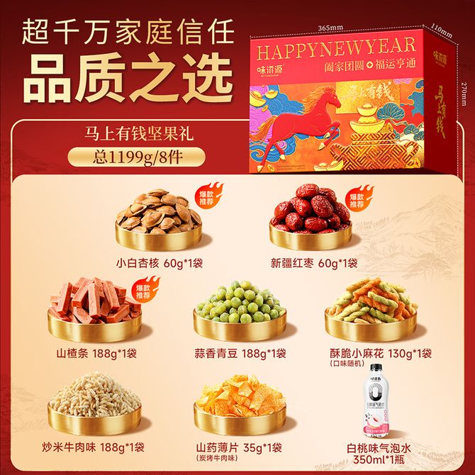 味滋源 马上有钱零食礼盒 年货零食坚果饮料大礼包 节日送礼佳品 配置:马上有钱零食礼盒1199 兑换价格 1700 里程 会员卡别 终身白金卡 白金卡 金卡 银卡 普通卡 儿童卡 服务 由 壮乡优品生活馆 发货并提供售后 规格: 礼盒 购买数量: 件 库存件 配送地址: 立即购买 加入购物车 成功添加到购物车 关闭 购物车共有 种商品 总金额为: 组合销售 产品介绍 产品规格 售后服务 产品咨询 发现好货 晋龙鲜鸡蛋40枚新鲜鸡蛋早餐营养食材1800g左右 2000 里程 黄天鹅 黄天鹅 可生食鸡蛋标准 3.18斤/盒30枚 3300 里程 沃隆每日坚果A款750g礼盒(25克*30) 6100 里程 晋龙鲜鸡蛋六无蛋30枚鸡蛋1.4kg礼盒装健康轻食早餐 1700 里程 稻香村 糕点礼盒1500g/盒 小吃点心礼盒 糕点点心礼盒 传统特产 3900 里程