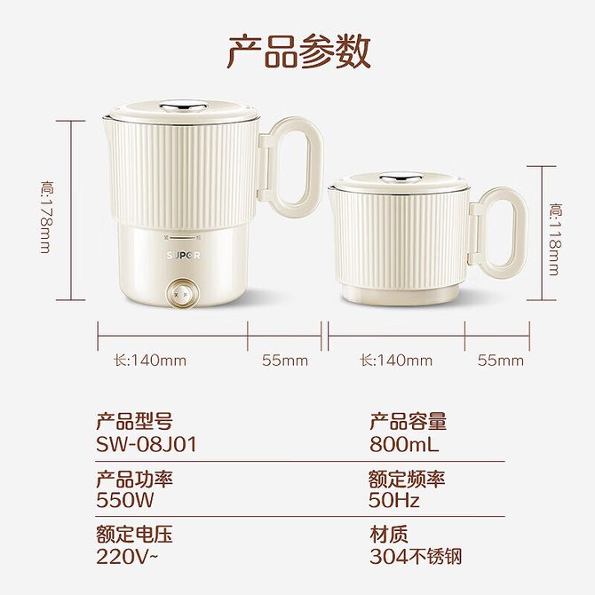 苏泊尔(SUPOR) 旅行出差家用养生冲奶电热水壶学生304不锈钢泡面杯 SW-08J01 便携式烧水壶电水壶可折叠0.8L 兑换价格 4800 里程 会员卡别 终身白金卡 白金卡 金卡 银卡 普通卡 儿童卡 服务 由 苏京优质生活 发货并提供售后 颜色: 其他 购买数量: 件 库存件 配送地址: 立即购买 加入购物车 成功添加到购物车 关闭 购物车共有 种商品 总金额为: 组合销售 产品介绍 产品规格 售后服务 产品咨询 发现好货 苏泊尔(SUPOR)电水壶 1.7L 不锈钢/YL SW-17S13A 5700 里程 志高/Chigo 电水壶烧水壶1.8L大容量电热水壶双层防烫自动断电家用烧水开水壶不锈钢 电水壶 DC-A18F 1900 里程 美的/Midea 电热水壶家用大容量烧水壶热水壶双层防烫电水壶304不锈钢内胆自动断电分离式拔盖 MK-SH15X1-102 3000 里程 小熊/Bear 电水壶家用烧水壶 不锈钢自动断电恒温热水壶保温一体电热水壶1.5L容量 3500 里程 小熊/Bear 烧水壶电水壶热水壶电热水壶开水壶304不锈钢内胆双层防烫1.5L大容量ZDH-Q15U8 3000 里程