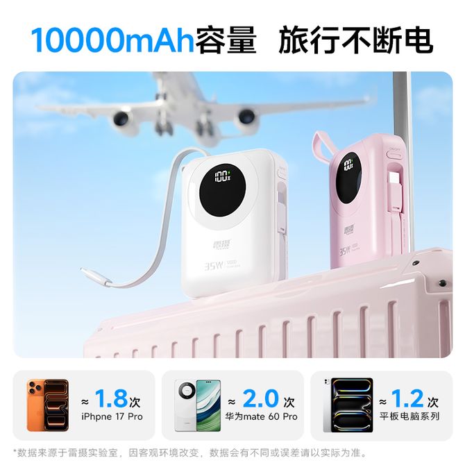 雷摄 MH816 35W超级快充 1万毫安 自带双线 【3C认证丨可上飞机】 兑换价格 3900 里程 会员卡别 终身白金卡 白金卡 金卡 银卡 普通卡 儿童卡 服务 由 雷摄官方旗舰店 发货并提供售后 电池容量: 8001mAh-10000mAh 颜色: 白色 浅绿色 粉色 购买数量: 件 库存件 配送地址: 立即购买 加入购物车 成功添加到购物车 关闭 购物车共有 种商品 总金额为: 组合销售 产品介绍 产品规格 售后服务 产品咨询 发现好货 ZNNCO 充电宝20000毫安时超薄小巧迷你自带线大容量快充移动电源便携苹果华为小米2万mAh手机 4200 里程 睿量/Remax 磁吸无线充电宝 Magsafe快充 5000mAh超薄小巧便携移动电源 手机背夹迷你移动电源 适用于苹果华为小米手机 RPP-107 4600 里程 纽曼(Newmine) 自带四线充电宝 3C认证 LED智能数显10000毫安移动电源 AL03 经典黑 3000 里程 雷摄 T68S【3C认证可上飞机】充电宝10000毫安 移动电源 22.5W快充丨1万毫安丨多口输出 1700 里程 纽曼 AL35大容量10000毫安时 22.5W超级快充充电宝 超薄小巧便携迷你 3700 里程