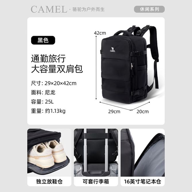 骆驼/Camel 双肩包书包大容量大学生登山包旅游旅行运动户外休闲电脑背包 573C373025,黑色 通勤旅行大容量双肩包 兑换价格 7100 里程 会员卡别 终身白金卡 白金卡 金卡 银卡 普通卡 儿童卡 服务 由 亿宇安百户外专营店 发货并提供售后 颜色: 黑色 购买数量: 件 库存件 配送地址: 立即购买 加入购物车 成功添加到购物车 关闭 购物车共有 种商品 总金额为: