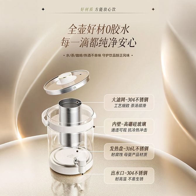组合销售 产品介绍 产品规格 售后服务 产品咨询 发现好货 九阳/Joyoung 养生壶1.5L茶具电茶壶煮茶壶花茶壶玻璃煮茶器煎药壶中药锅药膳电水壶烧水壶 3900 里程 美的/Midea 养生壶 1.5L家用多功能小型全自动办公室烧水壶加厚玻璃煮茶热水壶 MK-YS15P201 4200 里程 美的/Midea 养生壶 1.5L全自动电热水壶 24h预约12小时智能恒温 14大功能11档控温 花茶壶煮茶器MK-Y12Q 3500 里程 小熊/Bear 养生壶电热水壶煮茶器烧水壶家用1.5L煮茶壶全自动保温多功能电水壶花果茶壶YSH-C15W1 3900 里程 小熊/Bear 养生壶煮茶器烧水壶煮茶壶多段保温迷你玻璃花茶壶智能恒温电热水壶1.5L YSH-D15T3米黄色 4600 里程