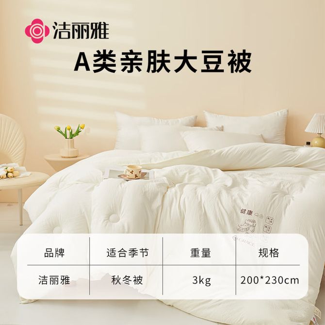 洁丽雅/Grace A类柔软&大豆被 CP1179/CP2528 填充:10%大豆纤维+90%聚酯纤维 面料:100%聚酯纤维 兑换价格 6000-7000 里程 会员卡别 终身白金卡 白金卡 金卡 银卡 普通卡 儿童卡 服务 由 吉时雨居家生活馆 发货并提供售后 被、单尺寸: 150*200cm 200*230cm 颜色: 其他 购买数量: 件 库存件 配送地址: 立即购买 加入购物车 成功添加到购物车 关闭 购物车共有 种商品 总金额为: 组合销售 产品介绍 产品规格 售后服务 产品咨询 发现好货 洁丽雅(Grace)全棉夏凉被棉花被双人空调被 纯棉被子可机洗 薄被芯 洛洛繁花 150*200cm(Grace) 6100-7400 里程 洁帛 A类零压力抗菌防螨纤维春秋四季被 3500-3900 里程 北极绒(Bejirog) 泡泡纱大豆纤维四季被 细腻温润吸湿透气不闷不燥 BJRB314 8000 里程 洁丽雅/Grace 10%大豆纤维 纤维被子 空调夏凉被 (多规格可选)CP2262柠檬青 2500-3400 里程 京东京造 暖暖大白被 100%原生纤维A类磨毛厚实保暖被子冬季被芯 4斤-6.8斤 多尺寸可选 5000-7000 里程