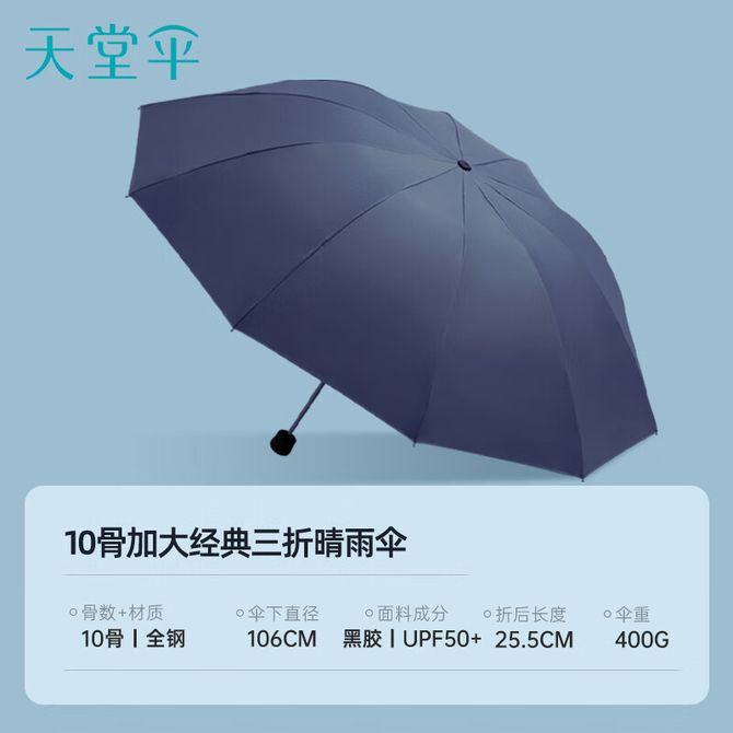 天堂 黑胶防晒 十骨 加大晴雨伞 三折 周一到周五 工作日发货 兑换价格 2000 里程 会员卡别 终身白金卡 白金卡 金卡 银卡 普通卡 儿童卡 服务 由 元素家居家纺专卖店 发货并提供售后 颜色: 藏青色 购买数量: 件 库存件 配送地址: 立即购买 加入购物车 成功添加到购物车 关闭 购物车共有 种商品 总金额为: 组合销售 产品介绍 产品规格 售后服务 产品咨询 发现好货 天堂伞 加大雨伞三折 晴雨两用商务伞10骨大雨伞男女 30721EJDX岩石蓝 1600 里程 雨景/rainscape 简约十骨大号男士三折雨伞 折叠伞 男女商务晴雨伞65CM*10骨 2200 里程 雨景/rainscape 男士全自动商务雨伞 十骨全自动晴雨伞 折叠商务伞 两用双人超大加固防风三折伞 4400 里程 美度(MAYDU) 三折自动雨伞环扣便挂手柄加固防风简约清新配色反向折叠雨伞 2800 里程 天玮伞业/Tianwei umbrella 雨伞 六折防晒防紫外线太阳伞 迷你便携小巧遮阳伞 1500 里程