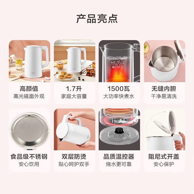 美的/Midea 1.7L电水壶烧水壶家用电热水壶 一体无缝内胆AEK1769 食品级304不锈钢内胆;水沸后自动断电, 兑换价格 3800 里程 会员卡别 终身白金卡 白金卡 金卡 银卡 普通卡 儿童卡 服务 由 万宸健康家电精品馆 发货并提供售后 颜色: 白色 购买数量: 件 库存件 配送地址: 立即购买 加入购物车 成功添加到购物车 关闭 购物车共有 种商品 总金额为: 组合销售 产品介绍 产品规格 售后服务 产品咨询 发现好货 苏泊尔(SUPOR)电水壶 1.7L 不锈钢/YL SW-17S13A 5700 里程 志高/Chigo 电水壶烧水壶1.8L大容量电热水壶双层防烫自动断电家用烧水开水壶不锈钢 电水壶 DC-A18F 1900 里程 小熊/Bear 电水壶家用烧水壶 不锈钢自动断电恒温热水壶保温一体电热水壶1.5L容量 3500 里程 小熊/Bear 烧水壶电水壶热水壶电热水壶开水壶304不锈钢内胆双层防烫1.5L大容量ZDH-Q15U8 3000 里程 志高(CHIGO) 电水壶1.8L大容量烧水壶家用热水壶开水壶DC-A18F 1900 里程