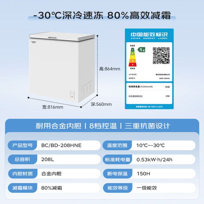 澳柯玛/Aucma 208升单温冷柜家用减霜冰柜冷藏柜冷冻柜小型冷柜卧式顶开门冰箱一级能效 BC/BD-208HNE 208L大容量 8档多级控温 长效锁冷 -30℃深冷速冻 兑换价格 54400 里程 会员卡别 终身白金卡 白金卡 金卡 银卡 普通卡 儿童卡 服务 由 弘济家电 发货并提供售后 颜色: 白色 购买数量: 件 库存件 配送地址: 立即购买 加入购物车 成功添加到购物车 关闭 购物车共有 种商品 总金额为: 组合销售 产品介绍 产品规格 售后服务 产品咨询 发现好货 TCL 162升双开门小冰箱家用小型两门节能省电静音宿舍租房冷藏冷冻柜R162L3-BZ 晶岩灰 47800 里程 美的(Midea)冰箱 BC-45M 45升单门迷你微型小冰箱租房宿舍办公室家用冷藏小型节能省电电冰箱低音 美妆可用 26100 里程 海信/Hisense 100升低霜家用小冰柜 一级能效冷藏柜冷冻柜 顶开门单温母婴母乳小冰箱BD/BC-100NUD 30400 里程 TCL 对开门冰箱 电脑控温 风冷无霜 217400 里程 美的/Midea 冰箱215升三门家用小冰箱宿舍租房节能低音三开门超薄迷你电冰箱BCD-215TM 62600 里程