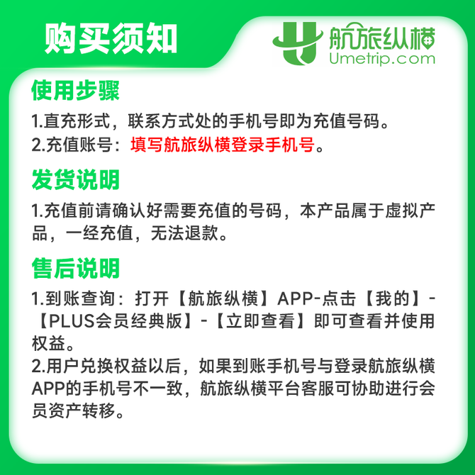 航旅纵横 PLUS会员年卡(领航版)飞行无忧 航旅VIP会员领航版 官方直充 联系方式处填写航旅纵横登录手机号充值即可 兑换价格 11800 里程 会员卡别 终身白金卡 白金卡 金卡 银卡 普通卡 儿童卡 服务 由 橙券生活服务专营店 发货并提供售后 卡券规格: 单张 购买数量: 件 库存件 立即购买 成功添加到购物车 关闭 购物车共有 种商品 总金额为: 组合销售 产品介绍 产品规格 售后服务 产品咨询 发现好货 话说分 机场消费代金券 30元 1600 里程 话说分 机场消费代金券 50元 2700 里程 话说分 机场消费代金券 100元 5300 里程 话说分 机场消费代金券 200元 10600 里程 翼支付 话费权益包 100元 5700 里程