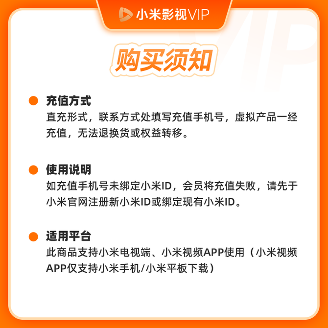 小米影视会员 月卡 小米电视影视会员30天(电视端可用) 直充 下单前请确认充值手机号已绑定小米ID! 兑换价格 1600 里程 会员卡别 终身白金卡 白金卡 金卡 银卡 普通卡 儿童卡 服务 由 橙券生活服务专营店 发货并提供售后 卡券规格: 单张 购买数量: 件 库存件 立即购买 成功添加到购物车 关闭 购物车共有 种商品 总金额为: