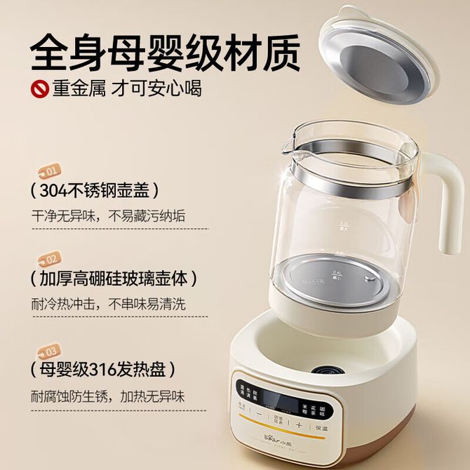 组合销售 产品介绍 产品规格 售后服务 产品咨询 发现好货 九阳/Joyoung 养生壶1.5L茶具电茶壶煮茶壶花茶壶玻璃煮茶器煎药壶中药锅药膳电水壶烧水壶 3900 里程 九阳/Joyoung 养生壶迷你玻璃花茶壶煮茶器 12大功能11档温度 电水壶热水壶烧水壶 1.5L DGD1506BQ 3900 里程 美的/Midea 养生壶 1.5L家用多功能小型全自动办公室烧水壶加厚玻璃煮茶热水壶 MK-YS15P201 4200 里程 美的/Midea 养生壶 1.5L家用养生壶全自动玻璃烧水壶24h预约烧水壶12小时防干烧保护智能恒温 MK-YS15P202 3700 里程 美的/Midea 养生壶 1.5L全自动电热水壶 24h预约12小时智能恒温 14大功能11档控温 花茶壶煮茶器MK-Y12Q 3500 里程