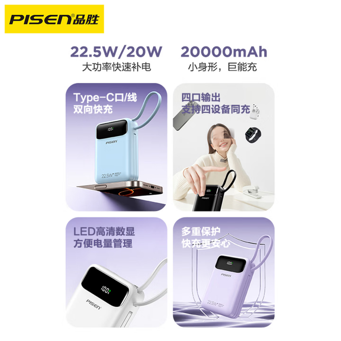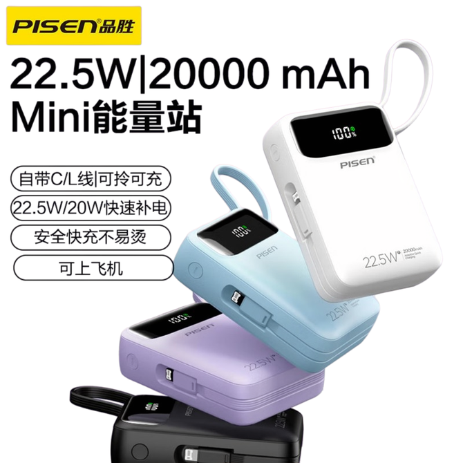 品胜(PISEN) 22.5W自带双线移动电源 3C认证可上飞机 20000毫安充电宝 适用于苹果华为小米手机小巧便携 原装正品,1年质保 兑换价格 7400 里程 会员卡别 终身白金卡 白金卡 金卡 银卡 普通卡 儿童卡 服务 由 会天伦3C专营店 发货并提供售后 电池容量: 10001mAh-20000mAh 颜色: 白色 黑色 蓝色 紫色 购买数量: 件 库存件 配送地址: 立即购买 加入购物车 成功添加到购物车 关闭 购物车共有 种商品 总金额为: