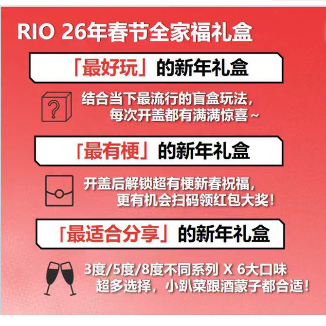 锐澳 鸡尾酒强爽清爽微醺6瓶组合装 6联年货趣味玩法 盲盒拆单满满惊喜 礼盒装 锐澳 预调鸡尾酒强爽清爽微醺系列6联年货趣味礼盒装 兑换价格 2400 里程 会员卡别 终身白金卡 白金卡 金卡 银卡 普通卡 未满18岁禁止饮酒,过量饮酒有害健康 服务 由 苏发食品商城 发货并提供售后 规格: 礼盒 购买数量: 件 库存件 配送地址: 立即购买 加入购物车 成功添加到购物车 关闭 购物车共有 种商品 总金额为: 组合销售 产品介绍 产品规格 售后服务 产品咨询 发现好货 锐澳 (RIO)清爽鸡尾酒混合三联罐(葡萄+白桃+草莓)330ML*24罐 整箱 5400 里程 锐澳 (RIO)微醺3度预调 鸡尾酒低度 果酒整箱 330ml*24罐5种口味混合整箱装 6700 里程 锐澳 微醺3度整箱330ml*24罐预调鸡尾酒果酒【口味随机】 6700 里程 锐澳 【整箱】RIO 清爽5度玫瑰葡萄500ml*12罐(零糖) 3900 里程 锐澳 微醺3度 清新青提茉莉味330ml*24罐(整箱) 6800 里程