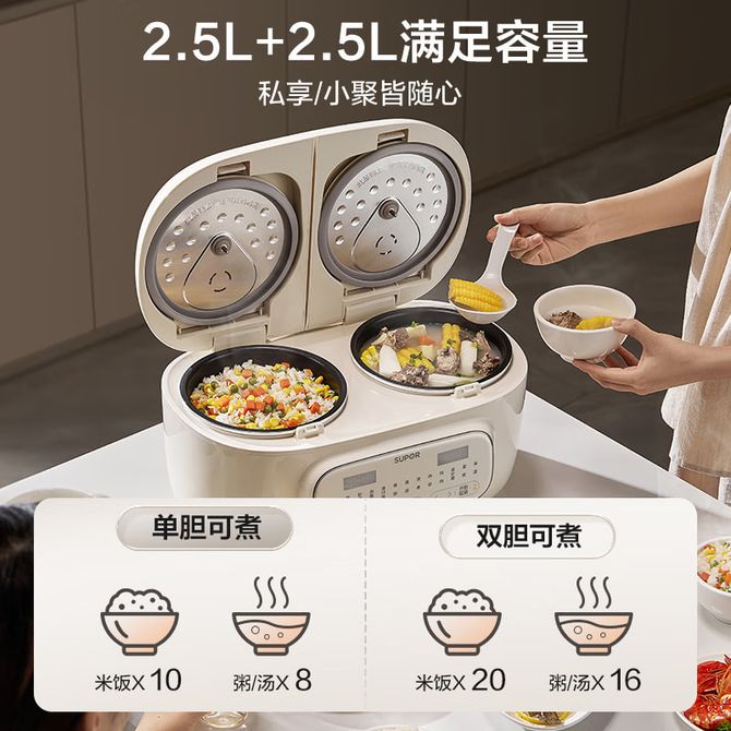 苏泊尔(SUPOR) 电饭煲 5L双胆大容量家用二合一煮饭煲汤一体双锅电饭锅双控多功能智能蒸煮锅微压 5L双胆大容量 双锅独立分控 十三大常用功能 兑换价格 26100 里程 会员卡别 终身白金卡 白金卡 金卡 银卡 普通卡 儿童卡 服务 由 中农创家电生活馆 发货并提供售后 颜色: 其他 购买数量: 件 库存件 配送地址: 立即购买 加入购物车 成功添加到购物车 关闭 购物车共有 种商品 总金额为: