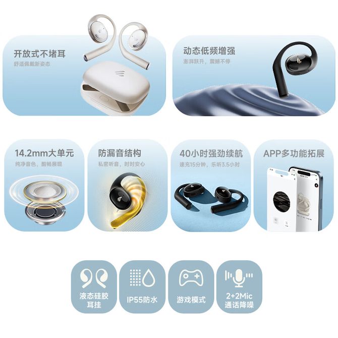 漫步者/EDIFIER 开放式蓝牙耳机 挂耳式真无线HiFi音质 双麦降噪长续航音乐耳麦X-Fit 开放式不堵耳防漏音,14mm大单元,双麦降噪通话,APP拓展,液态硅胶耳挂,IP55防水 兑换价格 18000 里程 会员卡别 终身白金卡 白金卡 金卡 银卡 普通卡 儿童卡 服务 由 智科精品 发货并提供售后 颜色: 白色 购买数量: 件 库存件 配送地址: 立即购买 加入购物车 成功添加到购物车 关闭 购物车共有 种商品 总金额为: