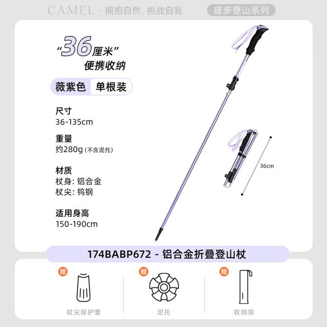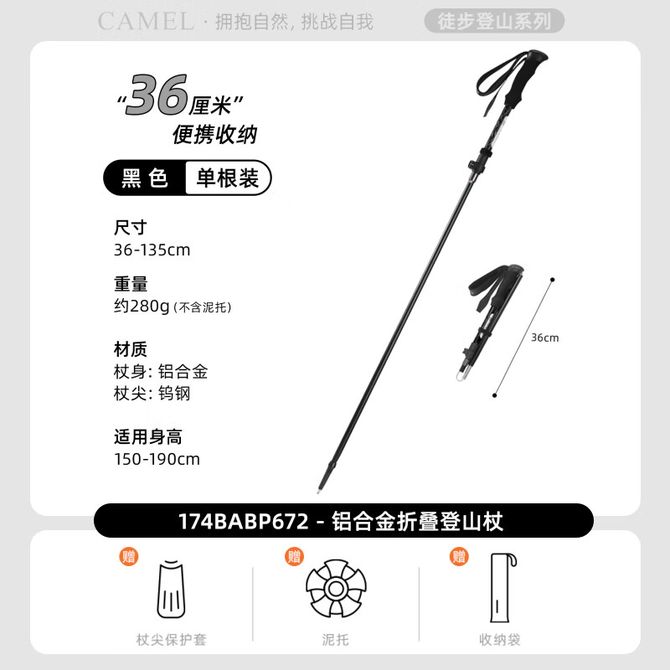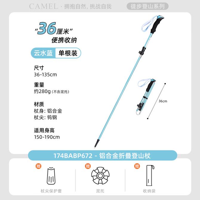 骆驼/Camel 户外登山杖手杖轻量折叠铝合金拐棍徒步爬山装备老人拐杖防滑174BABP672 展开尺寸34-135cm,收纳尺寸:34cm 兑换价格 3500 里程 会员卡别 终身白金卡 白金卡 金卡 银卡 普通卡 儿童卡 服务 由 劲芳体育生活馆 发货并提供售后 颜色: 黑色 红色 蓝色 紫色 购买数量: 件 库存件 配送地址: 立即购买 加入购物车 成功添加到购物车 关闭 购物车共有 种商品 总金额为: