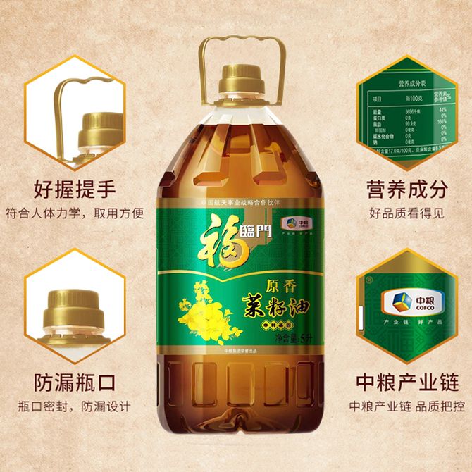 福临门 非转基因原香菜籽油-5L 方便易取防漏瓶口