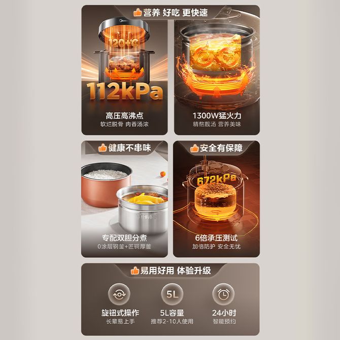 组合销售 产品介绍 产品规格 售后服务 产品咨询 发现好货 苏泊尔(SUPOR)电压力锅 6升大容量 智能触控 球釜双胆 开盖收汁 一键排压 SY-60YC8001Q 高压锅 16900 里程 美的/Midea 电压力锅家用5L大容量多功能高压锅双胆一键收汁智能预约不粘电高压锅电饭锅煮粥煲汤锅 一锅双胆【一键收汁入味】 YL50M1-702 10600 里程 苏泊尔(SUPOR) 5L电压力锅家用电高压锅双胆高压电饭锅煮饭智能预约 SY-50YC8186 11300 里程 美的/Midea 电压力锅 【一锅双胆】5L全自动家用智能预约 上蒸下煮 不粘双胆煲汤炖肉 YL50Q3-451 10900 里程 美的/Midea 电压力锅 高压锅家用电压力煲智能预约电饭煲大容量多功能定时预约电饭煲3-8人单胆旋钮款4L MY-E4809 8700 里程