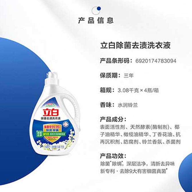 立白 除菌去渍洗衣液除螨去污渍家用洗衣液大瓶家庭装除菌去渍洗衣液3.08kg 轻松瓦解汗渍、血渍、油渍 奶渍等常见顽渍 兑换价格 2600 里程 会员卡别 终身白金卡 白金卡 金卡 银卡 普通卡 儿童卡 服务 由 广西北部湾网络科技有限公司 发货并提供售后 净含量: 其他容量 清洁剂容量: 其他容量 购买数量: 件 库存件 配送地址: 立即购买 加入购物车 成功添加到购物车 关闭 购物车共有 种商品 总金额为: 组合销售 产品介绍 产品规格 售后服务 产品咨询 发现好货 蓝月亮 深层洁净洗衣液4斤 1kgx1瓶+500gx2补充装 薰衣草香 强效去渍 1500 里程 威露士/Walch La有氧洗洗衣液套装 4斤松木清香(瓶1L+袋500ml*2) 除菌除螨 1900 里程 威露士 洗衣液除菌机洗手洗家用除螨去污1L*1瓶 1500 里程 蓝月亮 亮白增艳洗衣液2斤 1kg*1瓶 1100 里程 蓝月亮 护理洗衣液去污去渍 保护衣物纤维和原色 薰衣草香 1kg*2瓶 持久留香 速溶易漂 温和配方 1500 里程