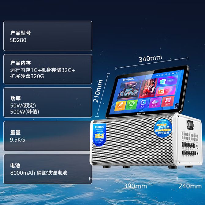 飞利浦(PHILIPS) 家庭ktv音响套装SD280 户外便携广场舞蓝牙音响带屏幕唱k歌专用移动音箱点歌机家用卡拉ok一体机 户外便携广场舞蓝牙音响带屏幕唱k歌专用移动音箱点歌机家用卡拉ok一体机 兑换价格 138300 里程 会员卡别 终身白金卡 白金卡 金卡 银卡 普通卡 儿童卡 服务 由 华睿博望 发货并提供售后 颜色: 银色 购买数量: 件 库存件 配送地址: 立即购买 加入购物车 成功添加到购物车 关闭 购物车共有 种商品 总金额为: